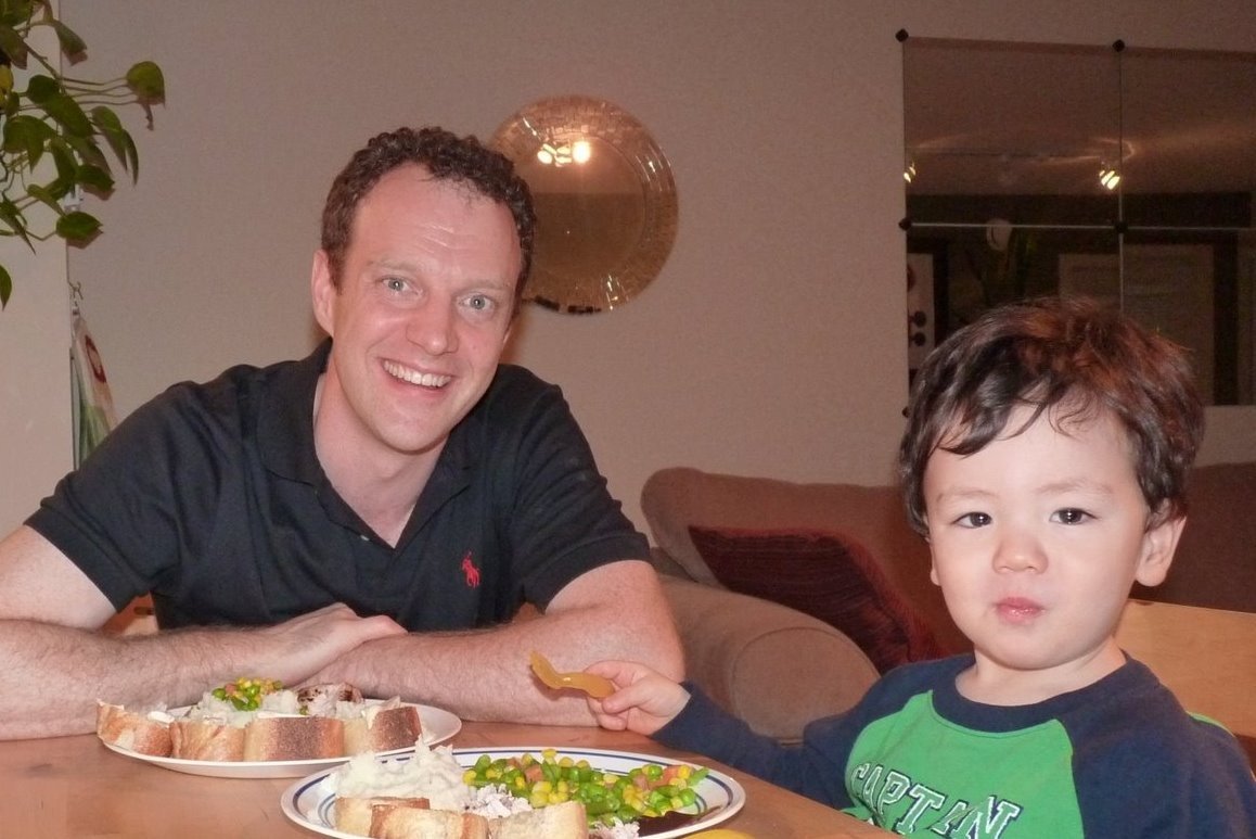 I have a few photos of Ryan and Daddy having fun.  In the manly tradition we had to have a manly meal….Barbequed Chicken, Mashed potatoes and veggies.